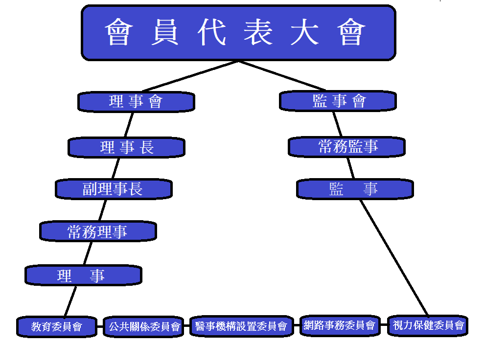 理事會置常務理事五人,由理事互選之,並由理事就常務理事中選舉一人為理事長。理事長對內綜理督導會務,對外代表本會,並擔任會員大會、理事會主席。